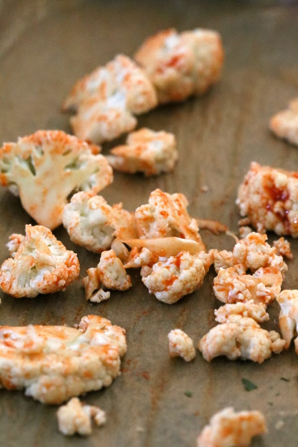 Toss the cauliflower in the Sriracha sesame oil and bake until golden.